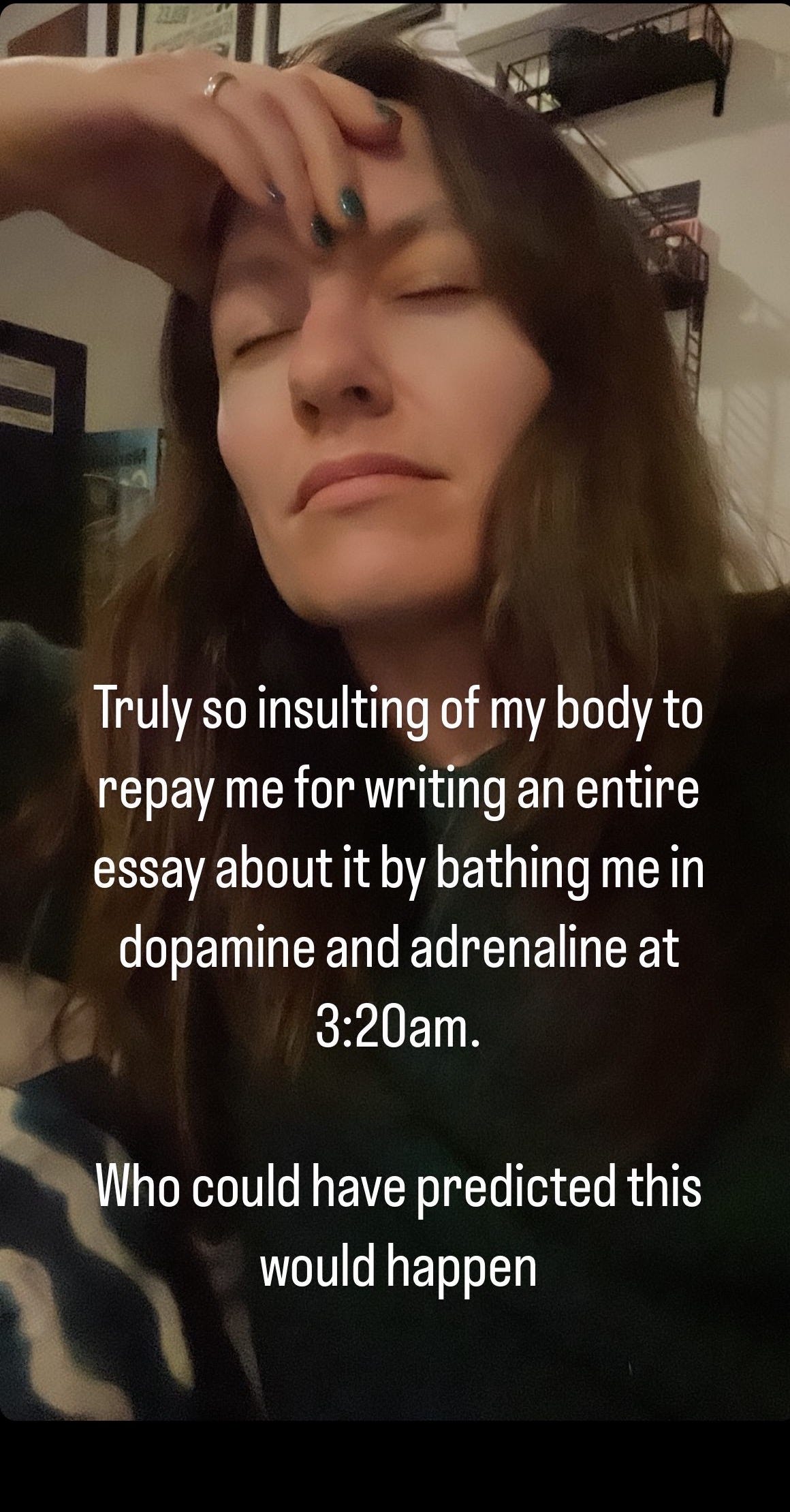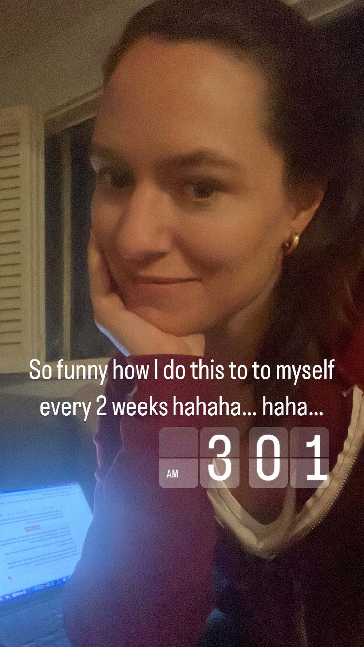 Early Monday morning/late “Sunday night”: If I tie the bow, then I hit publish at like, 2 or 3am. Knowing no one will see it until the morning, I am then flooded with both alertness and satisfaction from the delightful, motivating, wake-the-fuck-up neurotransmitters that will keep me up and vibing for at least another hour.