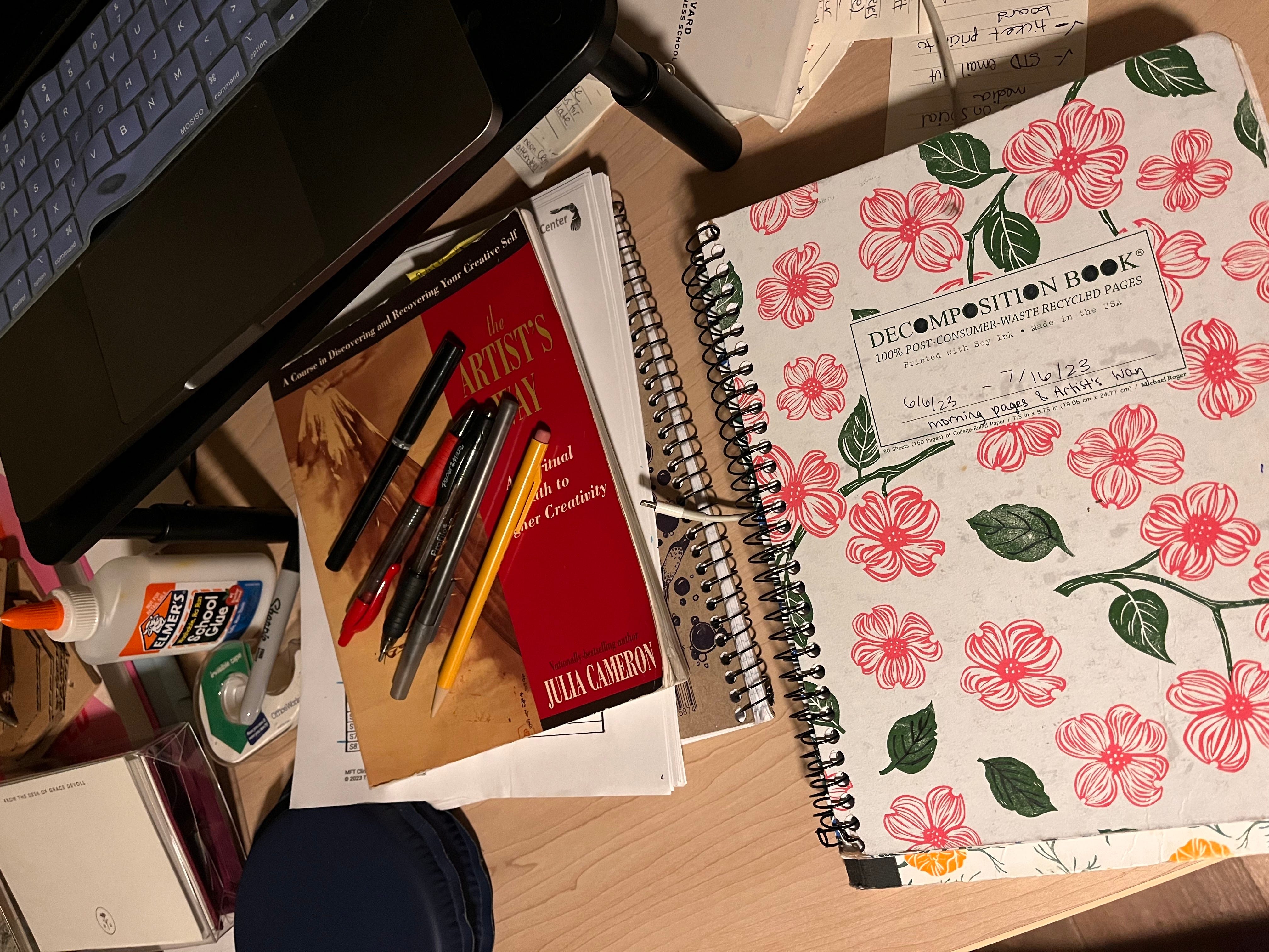 I filled up another notebook today. I wrote by hand to the bottom of the last page, closed the back cover, marked its end date on the front and slid it into chronological order in my notebook drawer: 6/6/23-7/16/23. Filling up notebooks provides one of the most satisfying dopamine hits to ever do it, but today it was extra special. Today was day 7 of week 12 of The Artist’s Way.